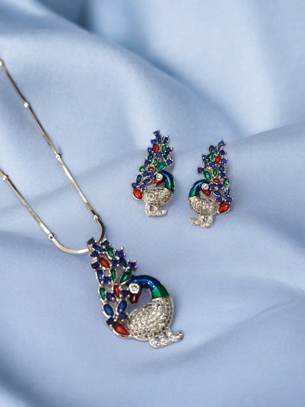 PEACOCK ENAMEL & CZ STONE STERLING SILVER 925 CHAIN PENDANT SET | GIFT | FOR WOMEN AND GIRLS PST021