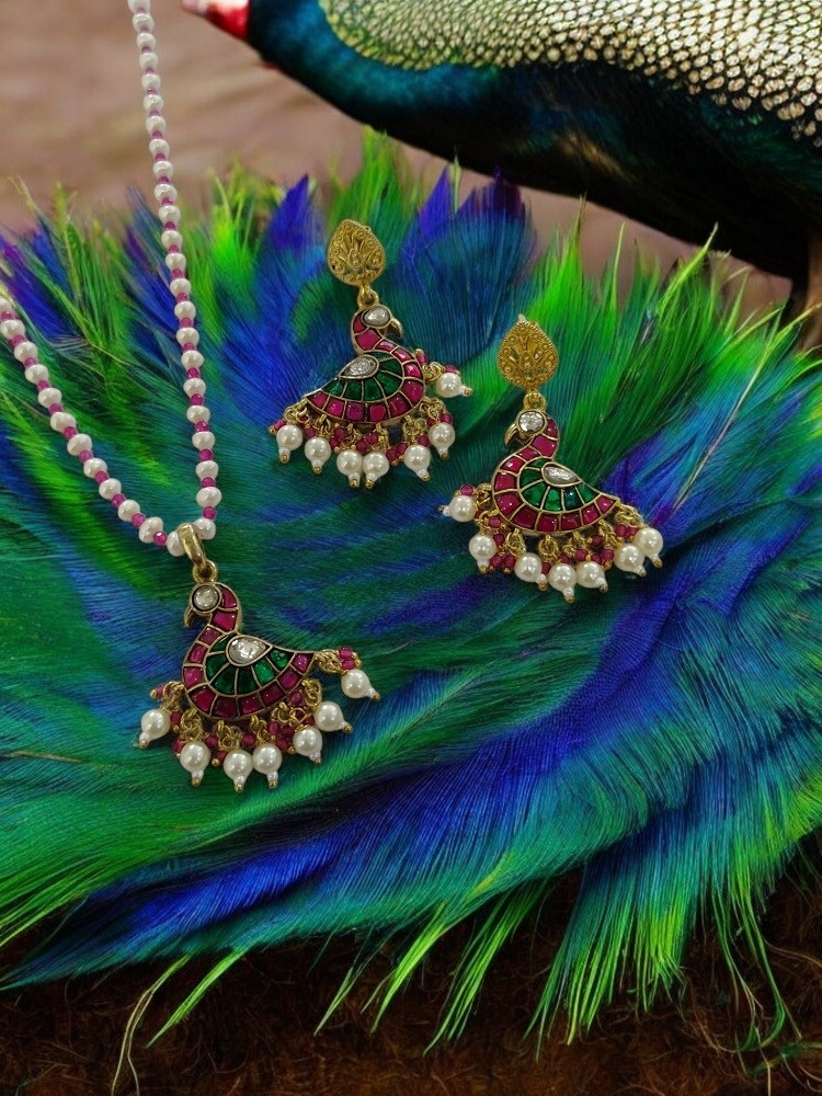 PURE SILVER 925 PEACOCK KUNDAN PENDANT SET WITH NATURAL PEARL BEADS STRING FOR WOMEN & GIRLS PST0026